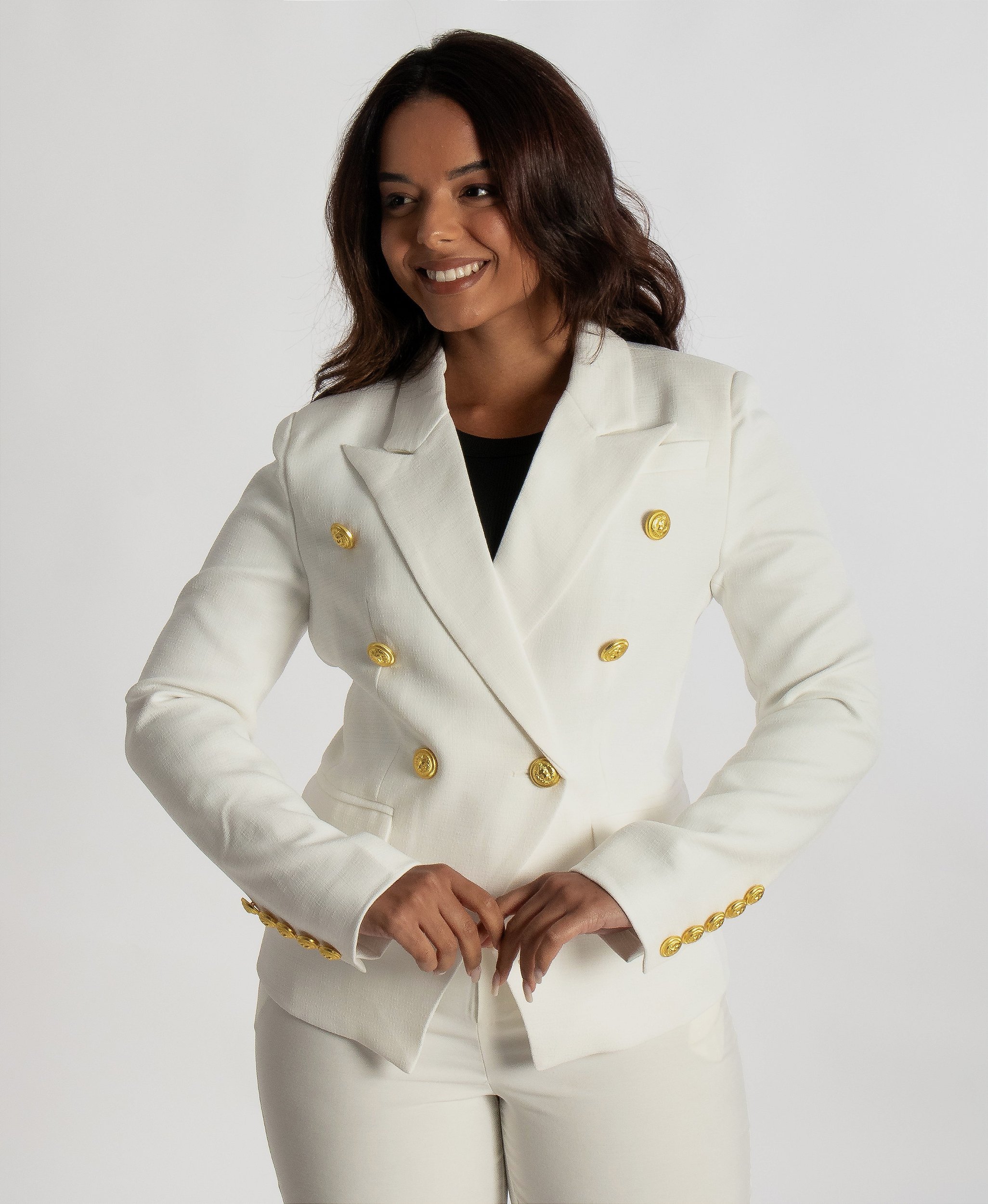 Um Blazer Alfaiataria inspirado na alta moda e pensado para mulheres poderosas. A frente com dupla abotoadura com botões de metal e as linhas elegantes criam um visual feminino e sofisticado que a levará do escritório a eventos com estilo.